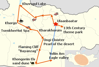 Highlights: City orientation tour, camel & horse riding trials, ancient capital city and museums, monasteries, hot spa, dinosaur site, National parks Khuvsgul, Khorgo, Khongor and Yoliin Am and their beauties, nomad, rein deer breeding families visits, boat cruise, much more funs. Duration: 17 nights/18 days |