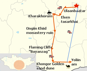 The tour length is about 2000 km, its ¼ by domestic plan. Mongolian great Gobi is semi-desert with rich flora\ fauna and there predominates artificial water. Gobi is famous by its beauties in the world. Exotic landscape, dinosaur’s sites, Bactrian two hump camels, mirage and oasis are make golden Gobi unique. Tourists traveling in this destination can discover its wonders, enjoy sun rise, setting. The tour has covered most Gobi attractions.