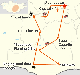 Highlights: City orientation tour, camel riding tour, Bayanzag dinosaur site, Eliin Am the eagle valley, Khongor National Park, Ongi cloister, ancient capital city and museum, Hustai National Park Prezevalski horse. Advantages of this tour 1. Gobi wonders discovering |